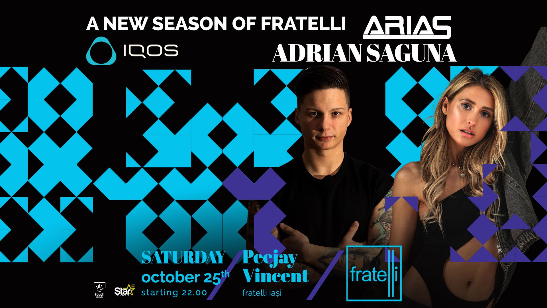 The space pulses with fresh energy, lights and sound merging into an unforgettable night. Adrian Saguna and Dj ARIAS take over the decks, guiding the rhythm, while PeeJay Vincent creates moments that make the night feel alive. Every beat, every glow, every movement comes together in an artistic experience you won't forget. Step in, feel it, and be part of a season like no other.